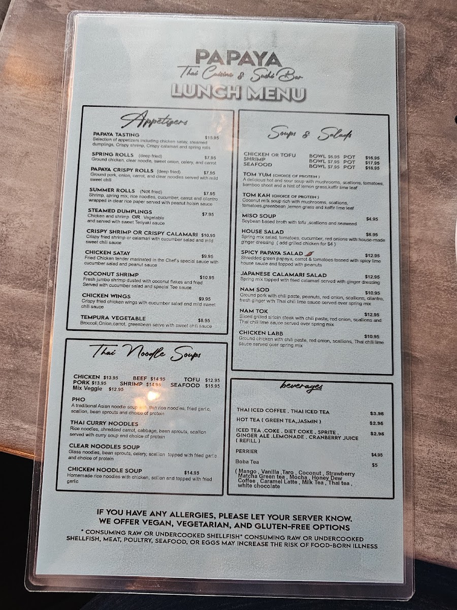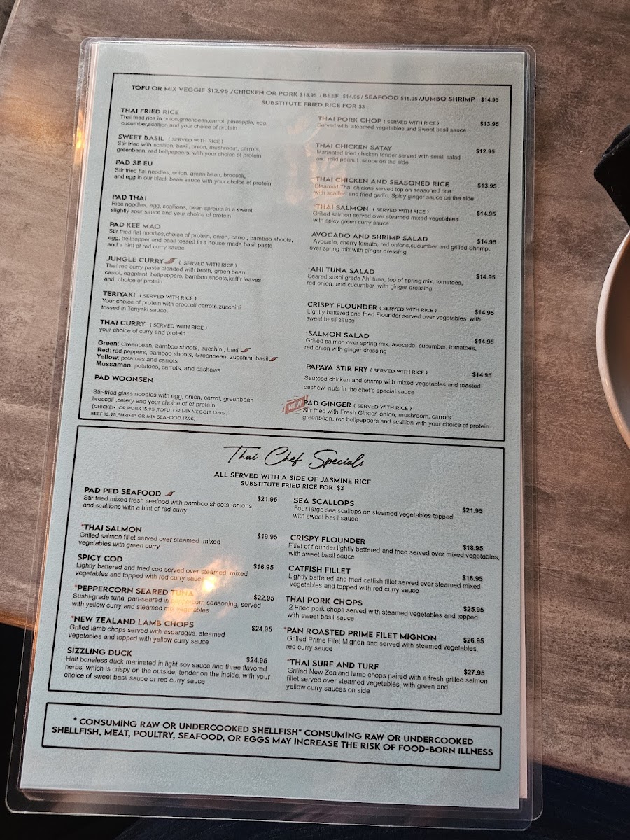 Clear soup with glass noodles, bean sprouts, celery, thai herb, amd topped with fried garlic and your choice of protein.