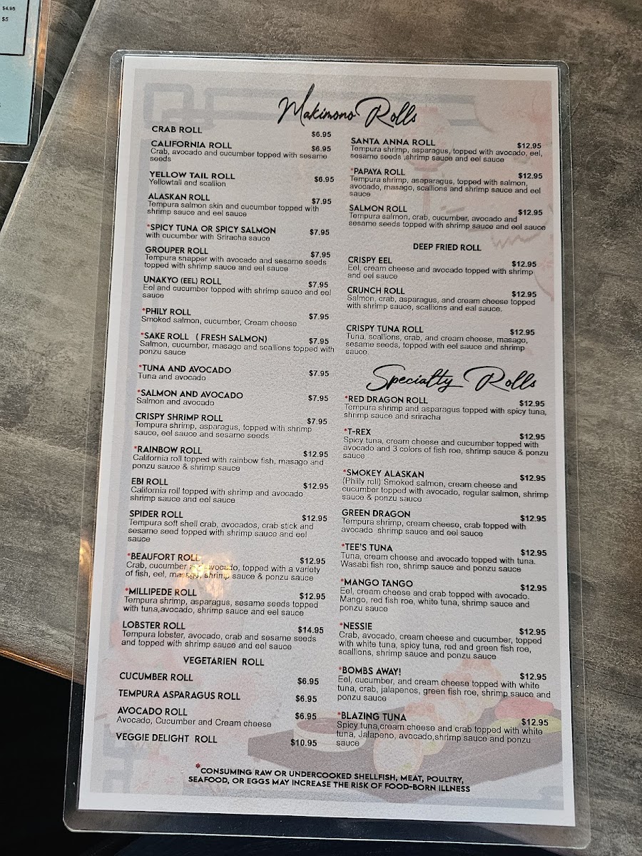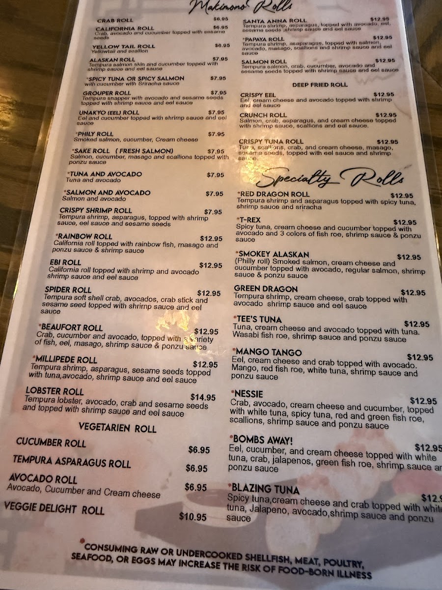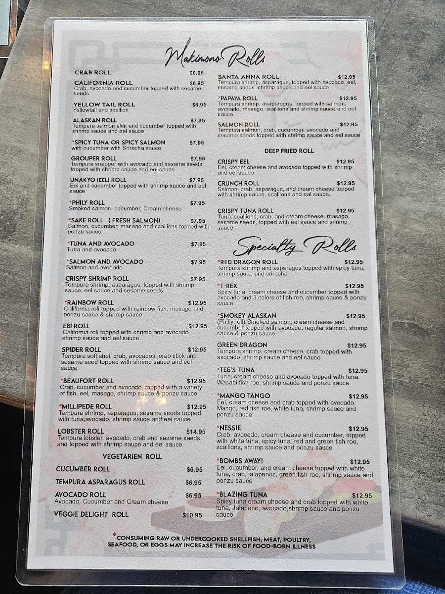 Salmon, crab, asparagus, and cream cheese. Whole roll is fried and topped with massago, scallions, shrimp sauce, and eel sauce.