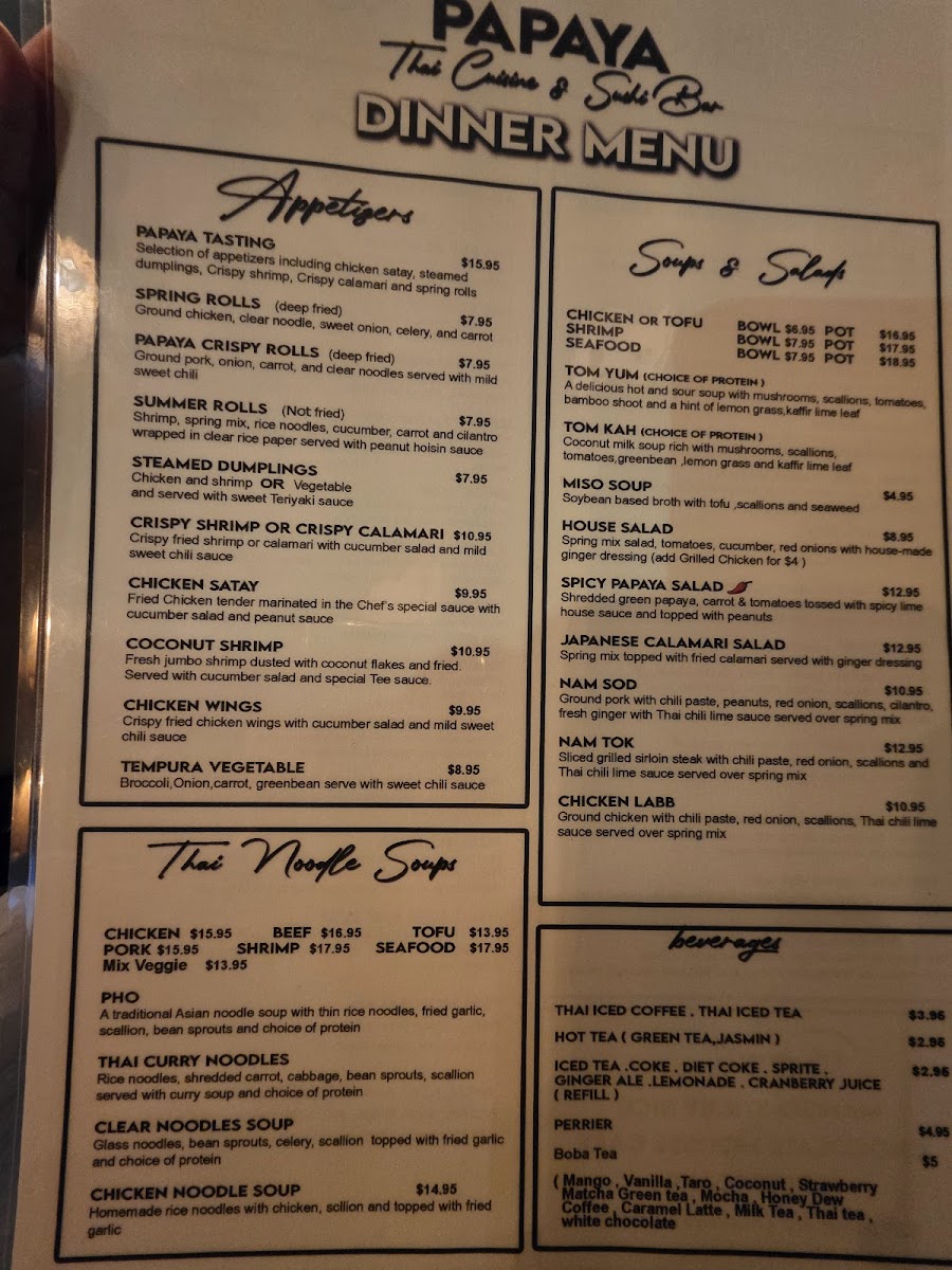 Shredded green papaya, carrot and tomatoes tossed with spicy lime house sauce fish sauce included and topped with peanuts.