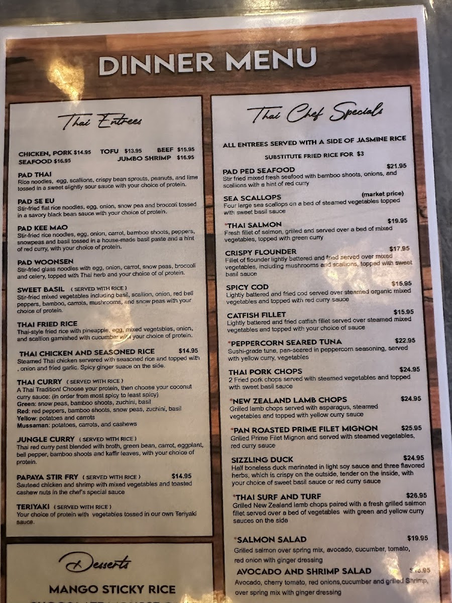 2 pan grilled pork chops served with steamed organic vegetables and topped with sweet Thai Basil sauce.